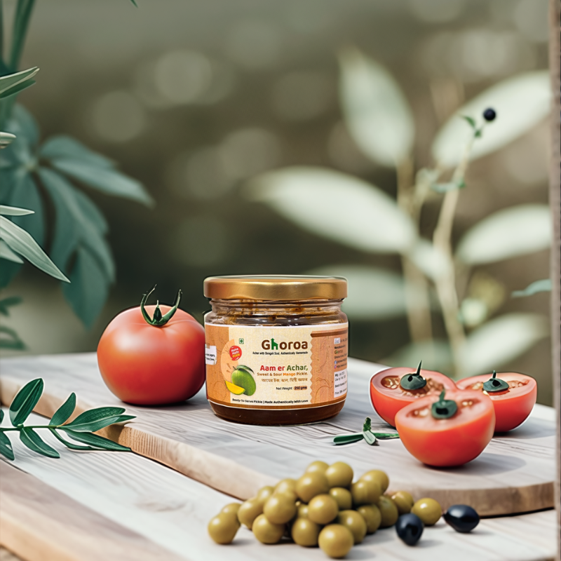 Experience the authentic taste of Bengal with Ghoroa’s Aam er Achar, a homemade mango pickle crafted from sun-dried mangoes. Prepared using carefully selected premium ingredients, this achar contains no preservatives or additives, ensuring a natural and wholesome flavor. Its unique sweet and sour balance delivers a traditional taste that complements any meal, reflecting true Bengali culinary heritage.