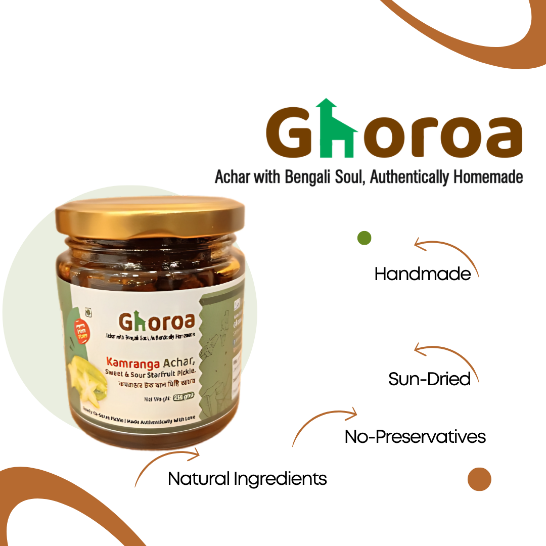 Experience the authentic taste of traditional Bengali cuisine with our Kamranga Achar. Made in small batches using sun-dried starfruit (Kamranga) without any artificial processes, this pickle balances sweet and sour flavors perfectly. Crafted from 100% natural ingredients without preservatives or additives, it offers a pure and wholesome taste. Ideal as a flavorful accompaniment to rice, parathas, or enjoyed on its own as a bold snack, this handcrafted pickle brings genuine Bengali flavor to your table.